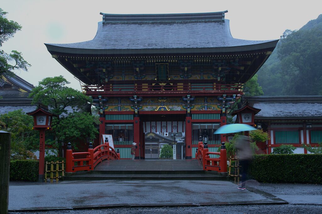 本殿は舞台造りの上に建てられた総漆塗りの建物で、神殿、拝殿、回廊が一体となった複合建築となっている。木々の緑に映える鮮やかな朱色と金色の装飾が織りなす極彩色の美しさは、まさに「鎮西日光」の名にふさわしい。