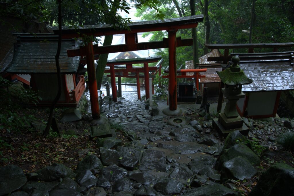本殿からさらに山道を約15分登ると、標高約150メートルの位置に奥之院がある。この奥之院は命婦社とも呼ばれ、岩窟の中に社殿が建てられている独特の構造だ。