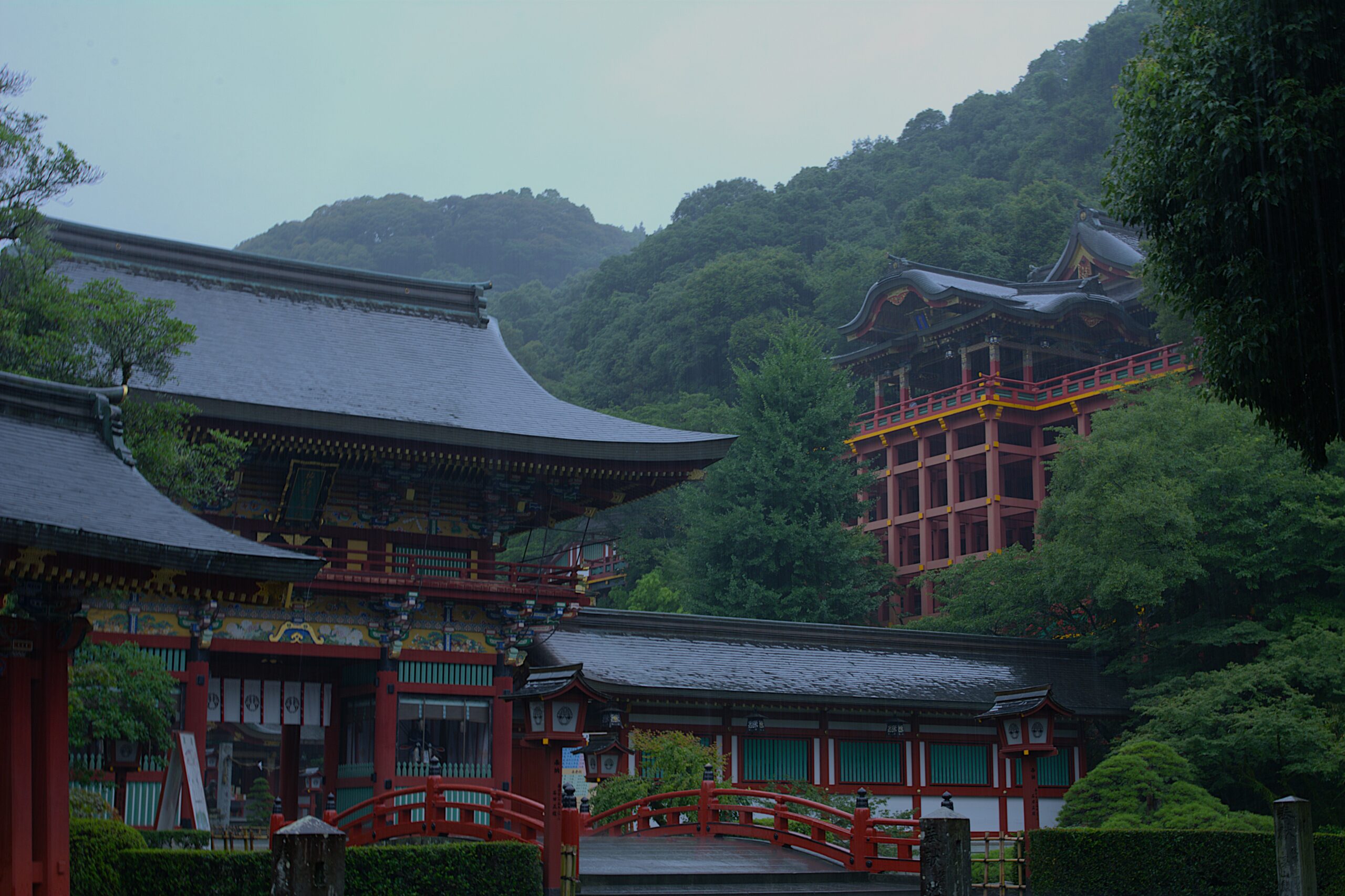 本殿は舞台造りの上に建てられた総漆塗りの建物で、神殿、拝殿、回廊が一体となった複合建築となっている。木々の緑に映える鮮やかな朱色と金色の装飾が織りなす極彩色の美しさは、まさに「鎮西日光」の名にふさわしい。