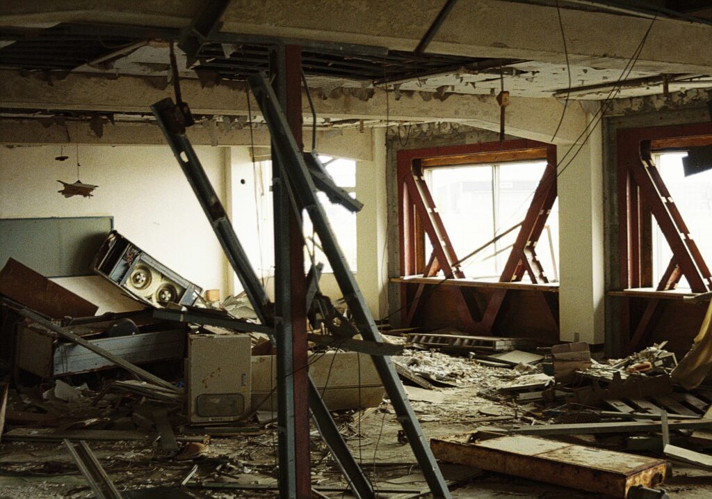 1968年に建てられた鉄筋コンクリート造4階建ての校舎は、津波によって4階まで被災しました。教室の窓ガラスは割れ、壁には津波の到達点を示すマークが残っています。階段室を上がりながら、自然の脅威がいかに建築を破壊するかを目の当たりにしました。設計者や施工者の名前は震災によって失われてしまいましたが、この建築そのものが震災の証人として、私たちに多くのことを語りかけています。
