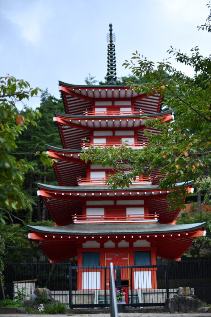 新倉山の中腹、398段の石段を登った先に現れる朱塗りの五重塔は、正式には富士吉田市戦没者忠霊塔といいます。この塔は昭和34年(1959年)から3年の歳月をかけて建立され、昭和37年(1962年)に完成しました。