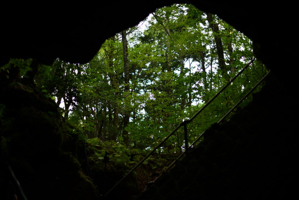 最後に訪れた富岳風穴は、貞観6年(864年)の富士山大噴火によって形成された溶岩洞窟です。昭和4年(1929年)に国の天然記念物に指定されたこの風穴は、総延長201メートル、高さ8.7メートルの横穴型洞窟で、青木ヶ原樹海の中に位置しています。