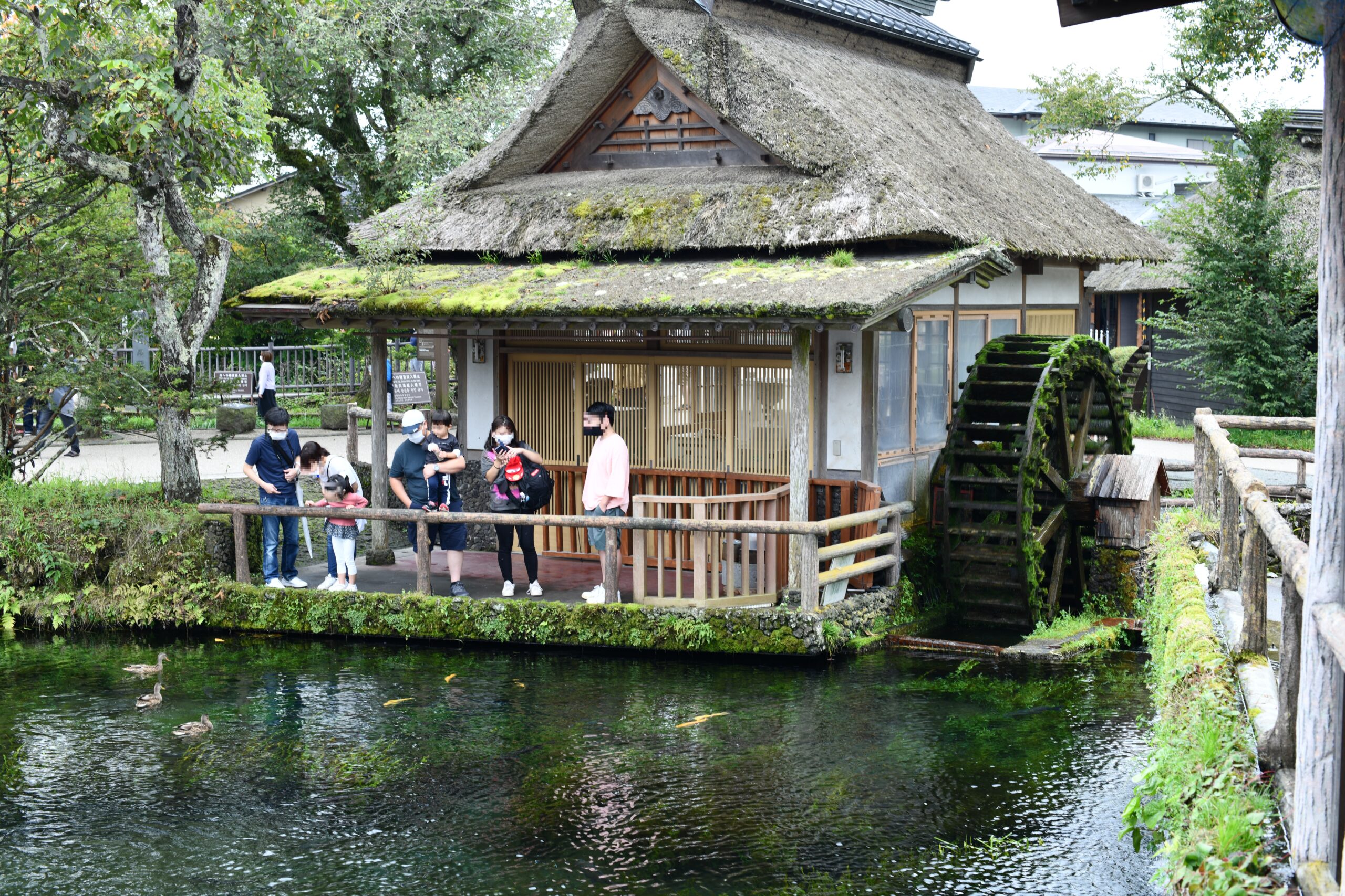 周辺には茅葺き屋根の民家が点在し、日本の原風景を今に伝えています。特に湧池のほとりに建つ木造の水車小屋は、湧水を利用して蕎麦を挽く伝統的な構造を持ち、機械を使わない木造のシンプルな仕組みで今も稼働しています。富士山を背景に、清冽な湧水と伝統建築が織りなす景観は、水と信仰と生活が一体となった日本の水景建築の傑作といえます。