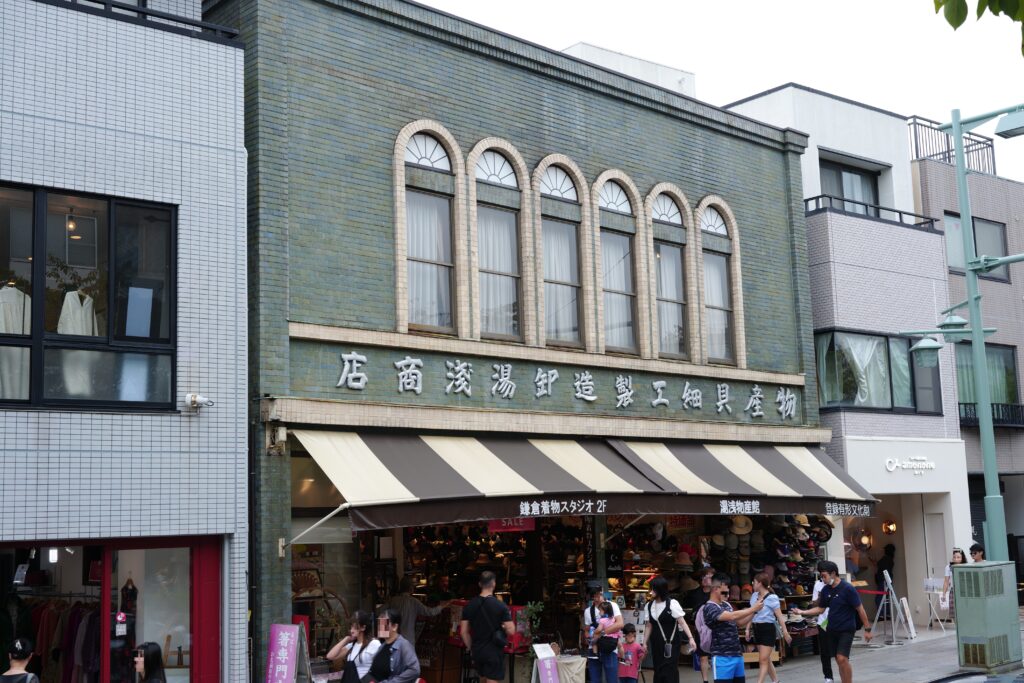 鎌倉駅から鶴岡八幡宮へと続く若宮大路。古都の中心を貫くこの通りを歩く観光客の多くは、中世の寺社仏閣に目を向ける。しかし足を止めて周囲に視線を移せば、道の両側には昭和初期に建てられた商店建築が今も静かに営業を続けている。今回訪れた湯浅物産館と三河屋本店は、戦前の鎌倉商業建築を代表する二つの建物だ。洋風の看板建築と伝統的な出桁造り、対照的な様式を持つこれらの建物は、どちらも同じ名工の手によって生み出された。