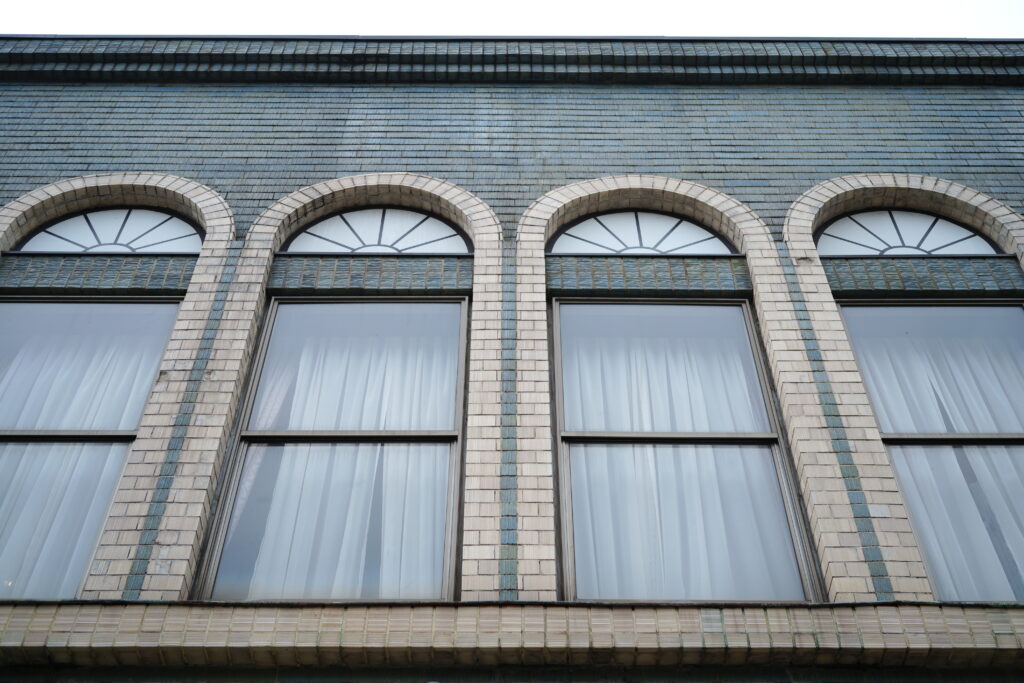 建物の最大の見どころは、そのファサードデザインにある。全面にスクラッチタイルを張り詰め、二階部分には半円形のファンライト(欄間)を備えた上げ下げ窓が6連で並ぶ。この窓の配列が生み出すリズム感と、タイルの質感が織りなす陰影は、戦前の商業建築が持つ独特のモダニズムを体現している。