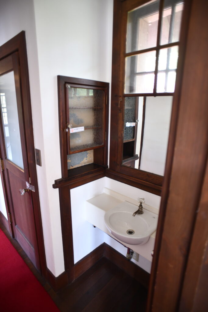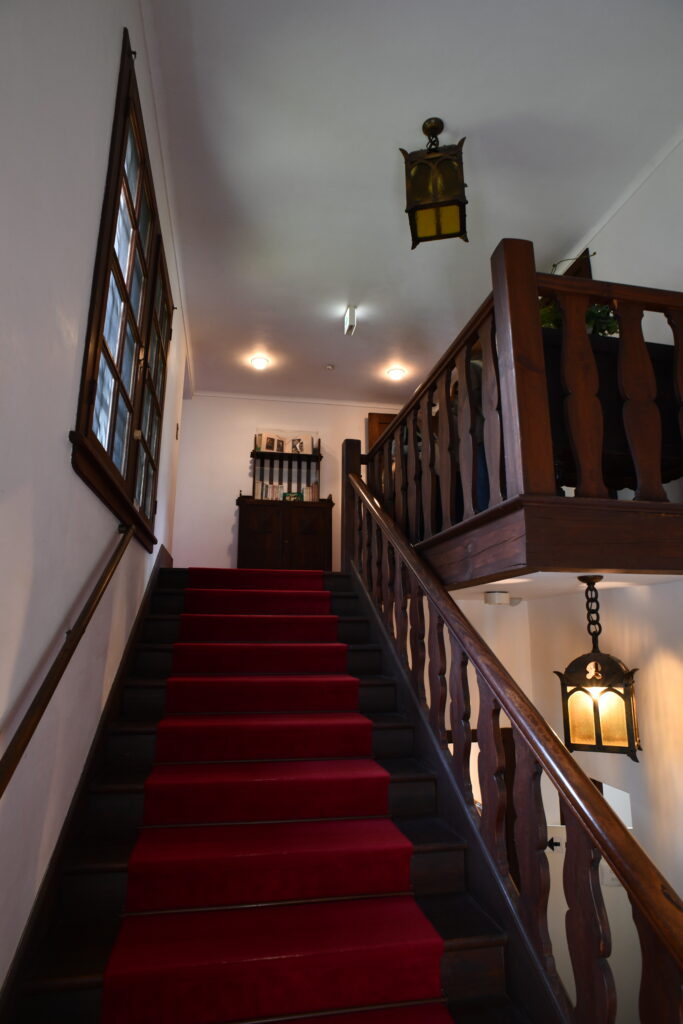 建物内に足を踏み入れると、時間が穏やかに流れているような感覚に包まれる。広間の天井を見上げれば、太い松の梁が力強く交差し、長年の歳月を物語る木材の表情が空間全体を支配している。これがヴォーリズの建築美学の本質——派手な装飾ではなく、素材そのものの重厚感と構造的な美しさである。