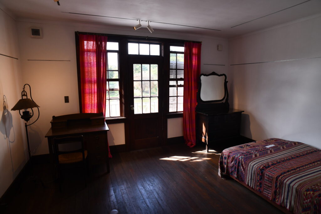 2階は朝吹一家の居住空間。東端の主寝室、登水子の書斎、西側の竹柄軽井沢彫テーブルが置かれた寝室、そして来客用寝室へと続く4つの空間が配置されている。階段は勾配が緩やかに設計され、踏み板の奥行きも広く、年配の家族や来客への配慮が明確に読み取れる。1階と2階の間には防音のためおが屑が敷き詰められ、夜間の音環境へのこだわりも見て取れる。