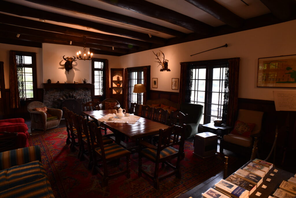 広間に置かれたダイニングテーブルはアメリカから取り寄せられたもの。シックな豪華さを演出する無垢材のテーブルの上に、登水子がフランスで購入した赤いカーテンが濃茶色を基調とする室内空間を彩る。暖炉には今も火を入れることができ、当時の生活の豊かさが現在まで継承されている。